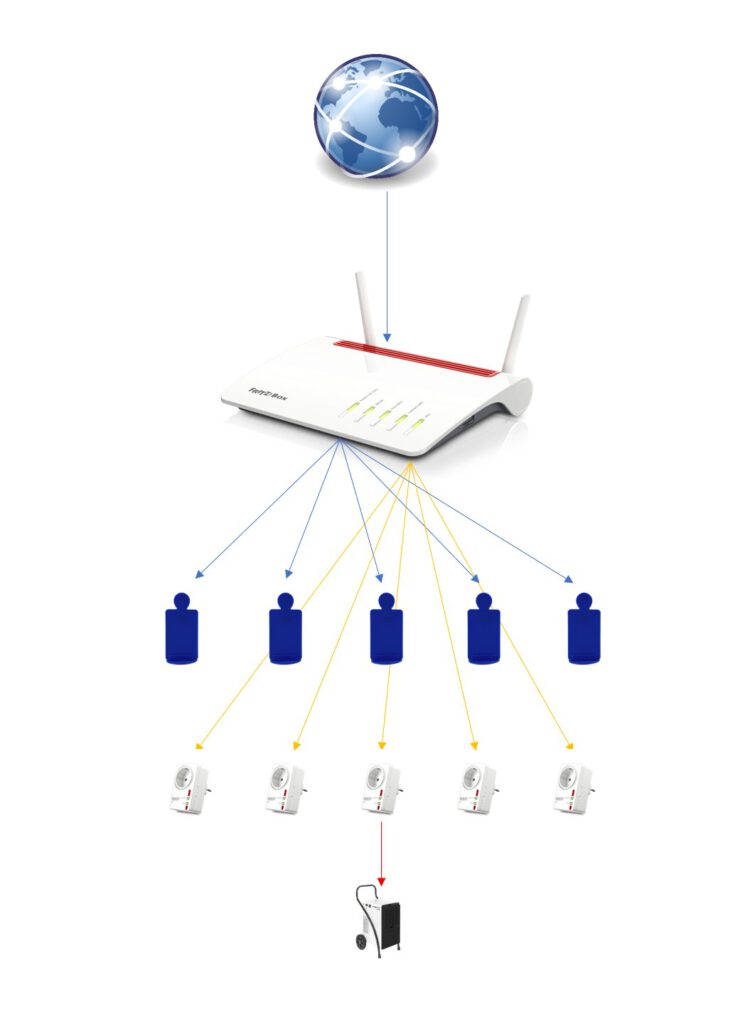 • 3 bzw. 5 FRITZ!DECT‑200 Schaltsteckdosen Diese Smart‑Home‑Steckdosen erlauben es, angeschlossene Geräte – etwa Trocknungsgeräte – automatisch oder manuell zu schalten. Damit lassen sich Trocknungsprozesse optimieren, Energie sparen und kritische Situationen vermeiden.